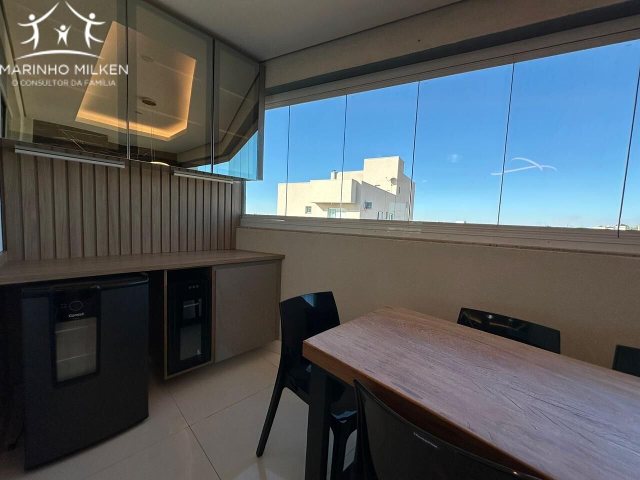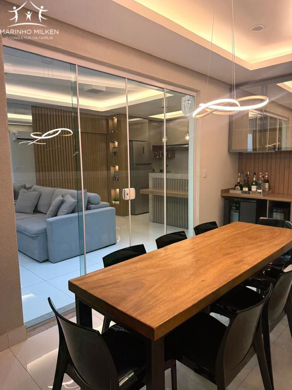 A varanda gourmet é um dos grandes diferenciais, equipada com churrasqueira revestida em porcelanato, cortina de vidro, cristaleira, adega, cervejeira, lustre em LED e uma mesa de madeira maciça para oito lugares. A sala de estar possui iluminação em tons frio e quente, móveis planejados, smart TV de 75 polegadas, ar-condicionado inverter de 12.000 BTUs e um sofá retrátil e reclinável de 2,40m, garantindo conforto total para momentos de lazer.