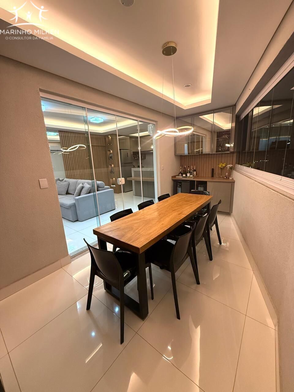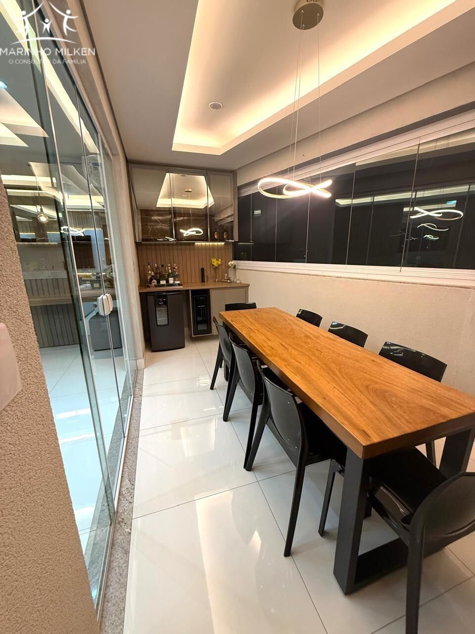 - Varanda Gourmet com churrasqueira revestida em porcelanato, cortina de vidro, cristaleira, lustre em led, mesa de madeira maciça 8 lugares com cadeiras, adega e cervejeira;