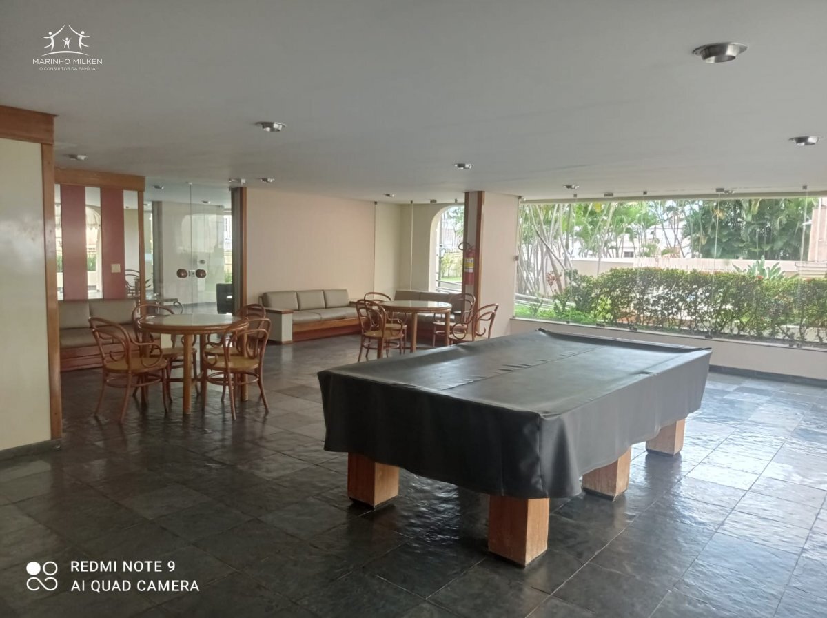 Área comum com 2 piscinas, quadra, salão de jogos, salão de festas.