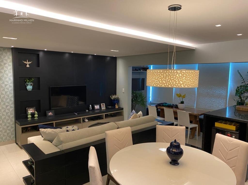 4 quartos sendo um revertido para closet da sute principal, 1 semi suite com armarios, sala em 2 ambiente com paineis,varanda integrada para sala e suite principal, banheiro social e lavabo, cozinha com armarios planejados, area de servico e cozinha com planejado com armario, ar condicionado na sala, suite e semi suite, 2 vagas livres e coberta, 2 elevadores, academia e servico de seguranca completo