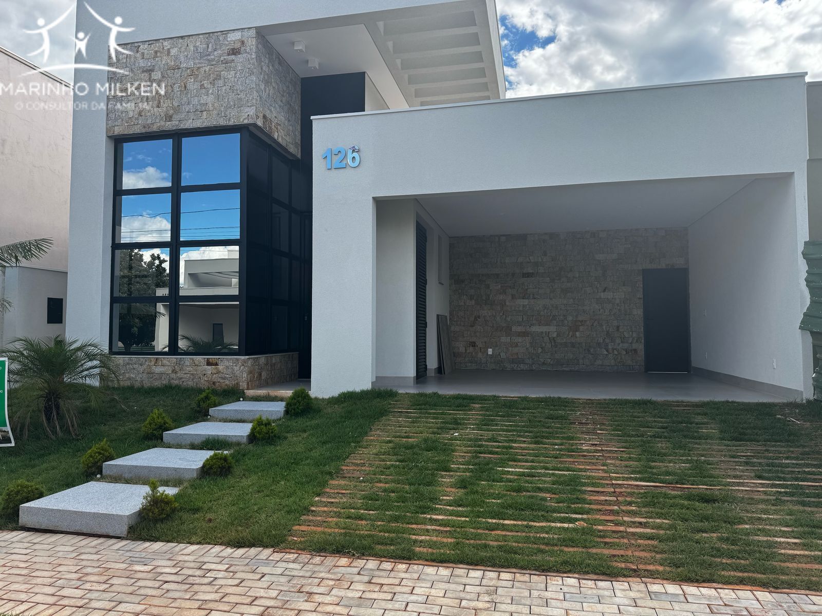 Fachada moderna com revestimento em pedra e pele de vidro, pintura externa 100% em arenato.
