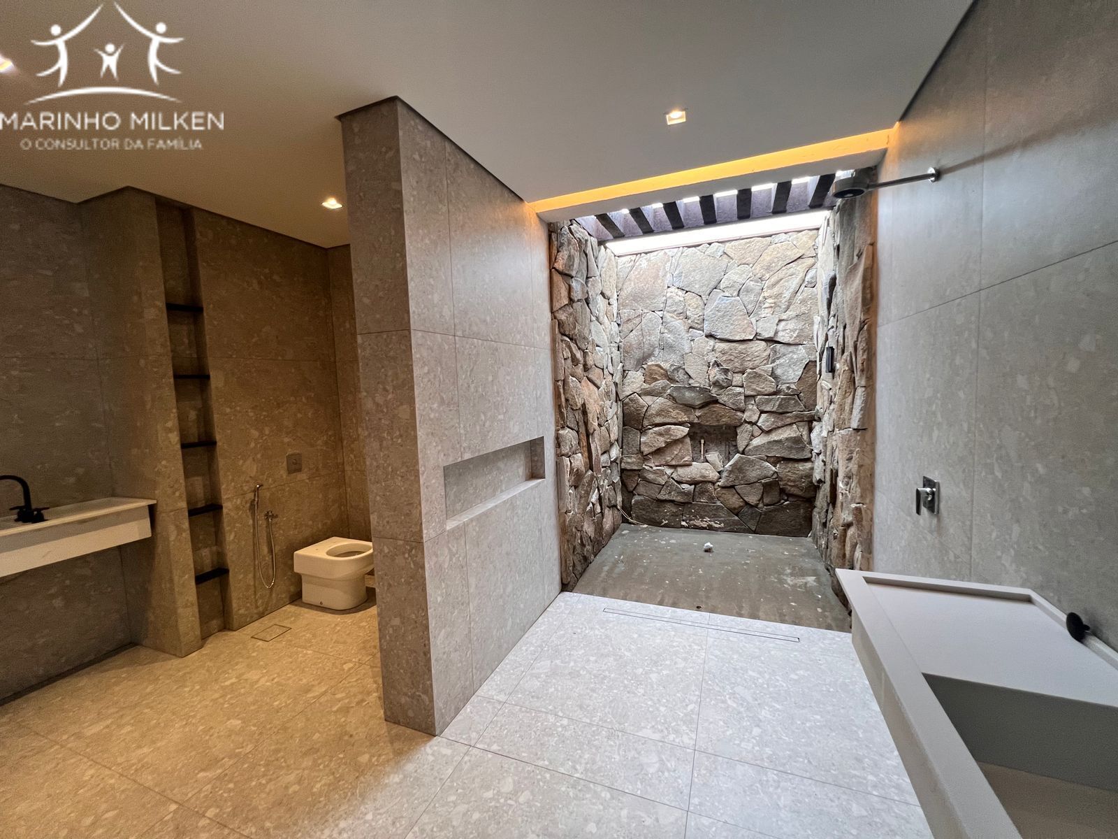 * Piso social, cozinha, gourmet, despensa, lavabo, sauna e escadas todo em travertino natural italiano