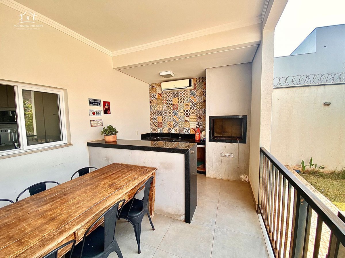 Casa de dois andares, com sala, sala de jantar, escritório, cozinha, lavanderia e despensa, 3 suítes com closet, piscina aquecida e lavabo.