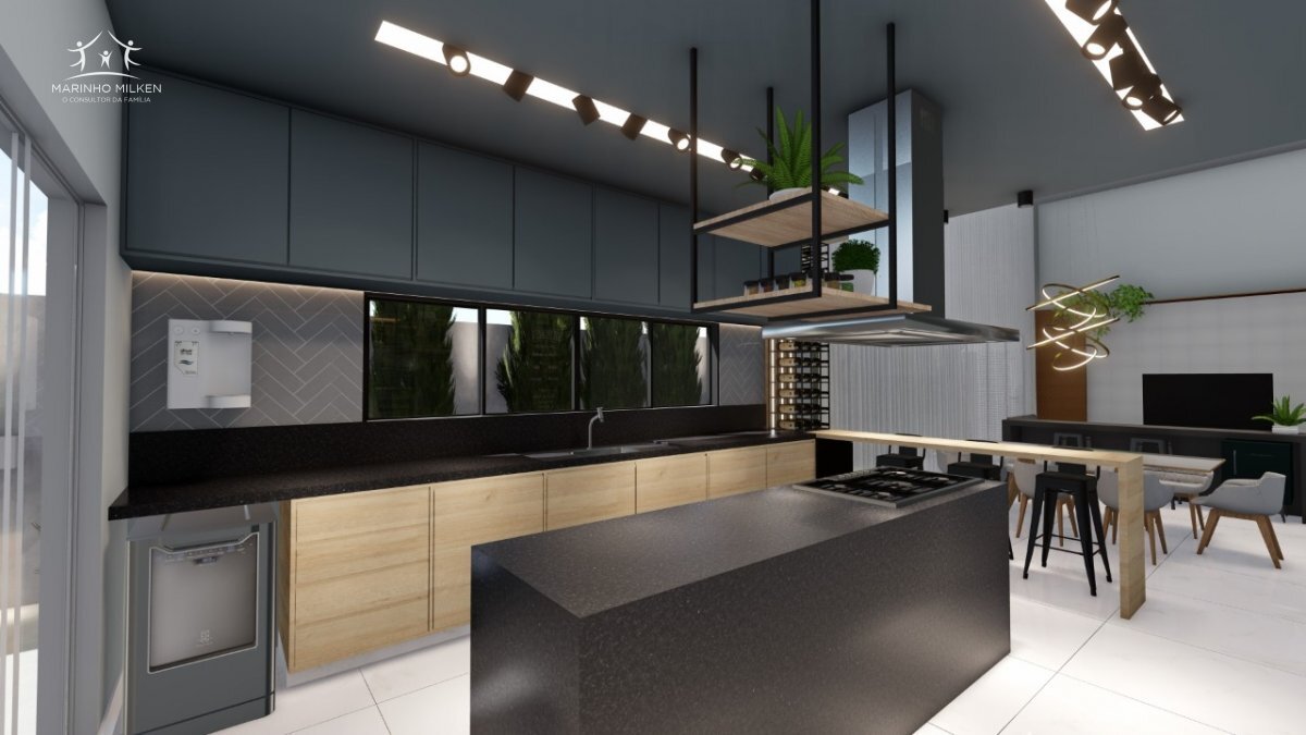 -Sala de TV e jantar integrados com pé direito duplo de 5,5m